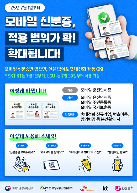 2025년 7월부터 SKT·KT·LGU+에서 휴대폰 개통 시 모바일 신분증(운전면허증, 주민등록증, 국가보훈증) 사용이 가능해집니다.