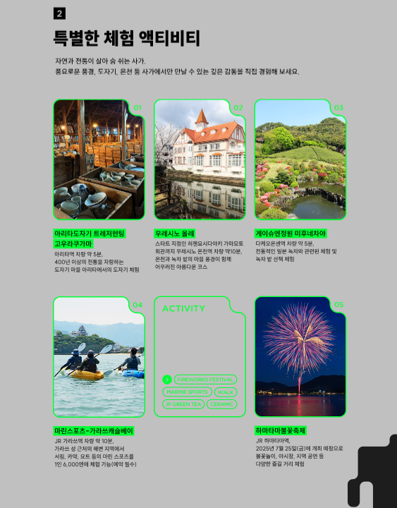 - 설명: 전통 아리타 도자기 공방에서 직접 도자기 체험 및 전시 쇼핑